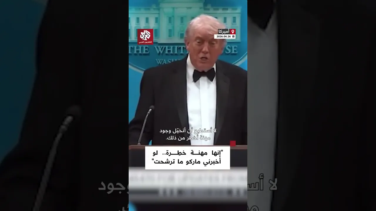 بعد حادث إطلاق النار في حفل عشاء مراسلي البيت الأبيض.. الرئيس الأميركي دونالد ترمب: لم يُخبرني أحد أن هذه مهنة خطِرة إلى هذا الحد ولو كان ماركو قد أخبرني، ربما لما ترشّحت.�
