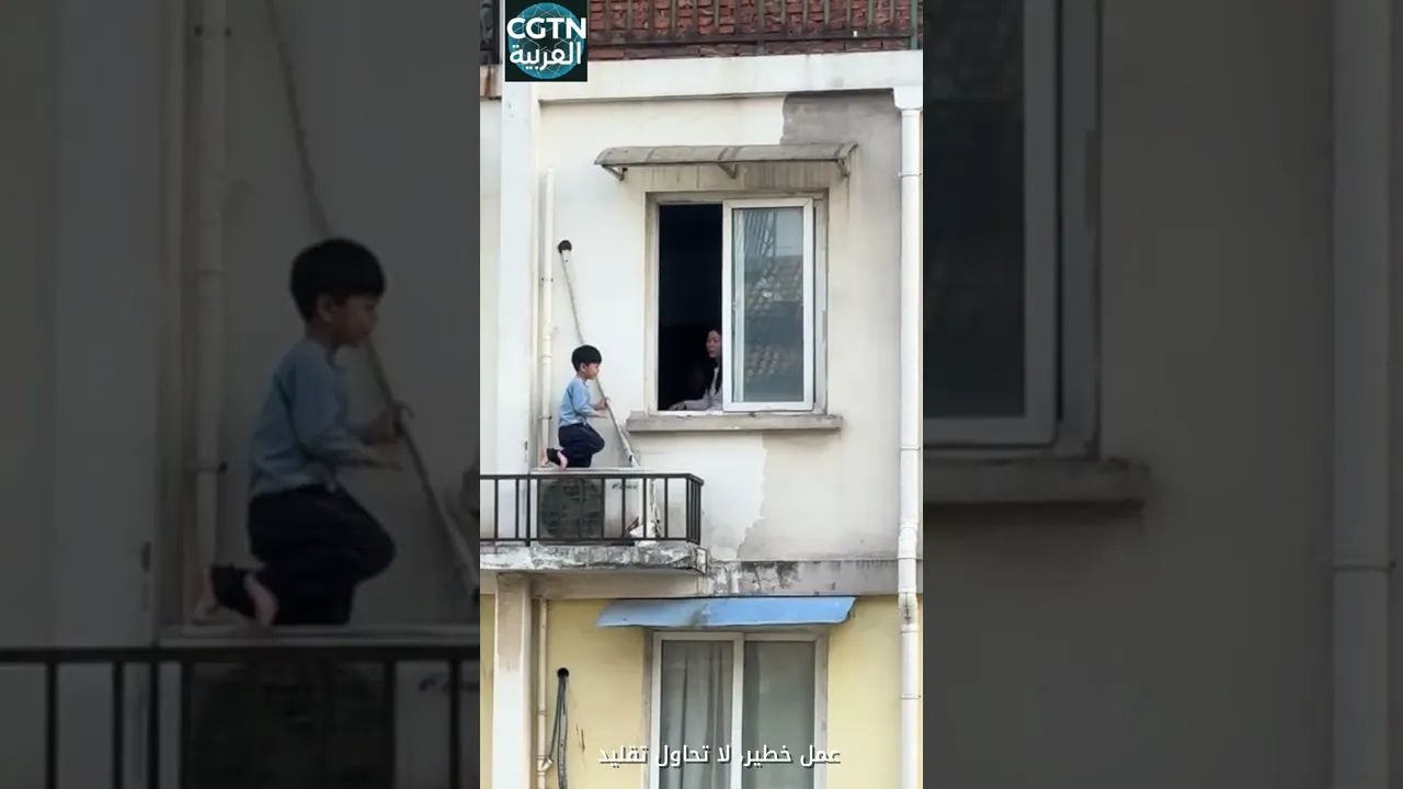 تسلّق طفل صغير في مقاطعة جيانغسو بمفرده من الشرفة إلى وحدة المكيّف الخارجية للعب!